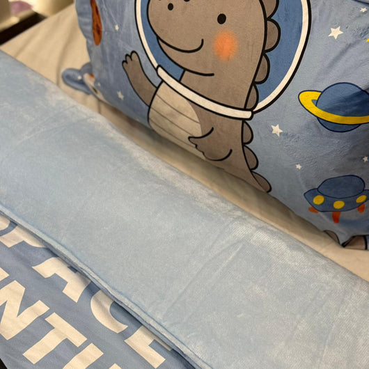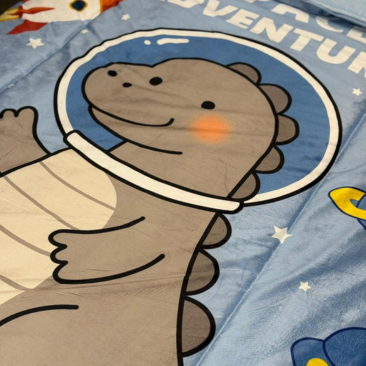 Featuring a cheerful dinosaur in space design, it sparks imagination while keeping your child warm.