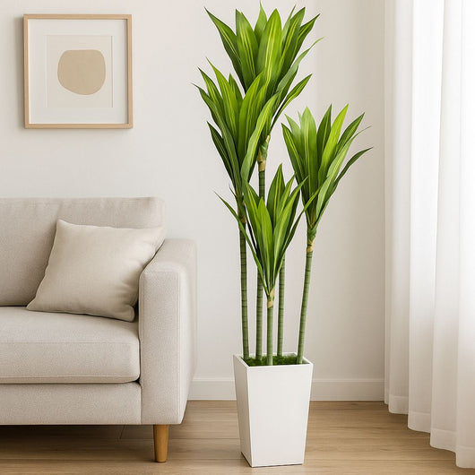 Standing 180 cm tall, it features realistic dracaena leaves arranged beautifully to create a natural look.