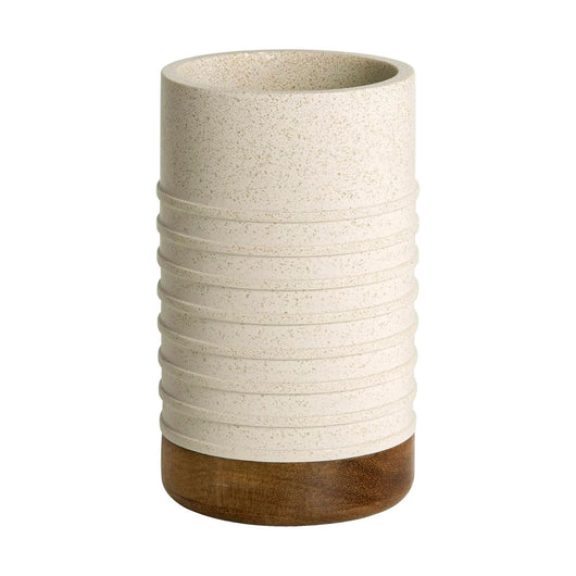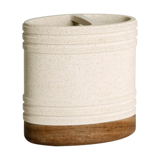 The elegant design adds a refined touch to any décor. The set includes a soap dispenser (H21cm/D7.5cm), soap dish (H4cm/L15cm/W10.5cm), toothbrush holder with two sections (H11cm/L11cm), and tumbler (H13cm/D8cm).