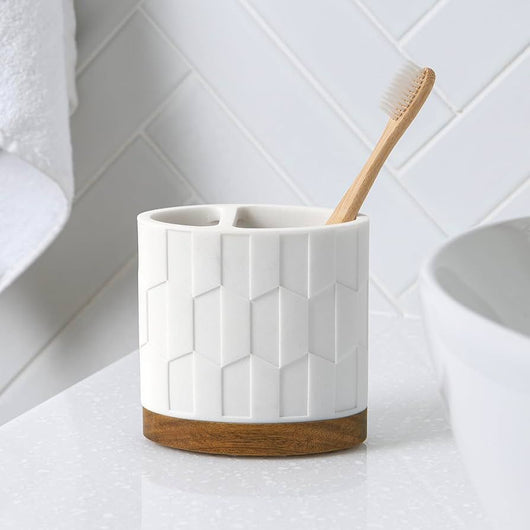 The elegant design adds a refined touch to any décor. The set includes a soap dispenser (H21cm/D7.5cm), soap dish (H4cm/L15cm/W10.5cm), toothbrush holder with two sections (H11cm/L11cm), and tumbler (H13cm/D8cm).