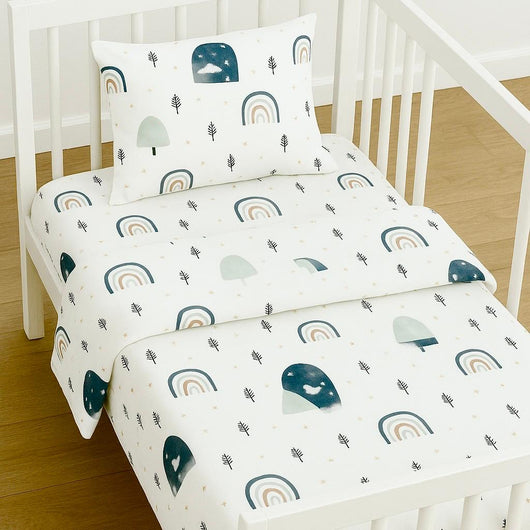 Suitable for baby park bed size, this 3-piece set includes a duvet cover (110x150 cm), a fitted sheet (70x130+15 cm) for a secure and snug fit, and two pillowcases (30x50 cm).
