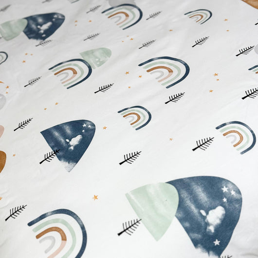 The COMFYB 100% Cotton Baby Park Bed Set in a charming rainbow design adds comfort and color to your baby’s sleep space.