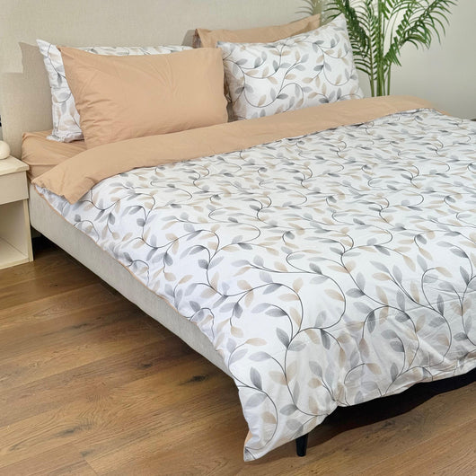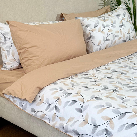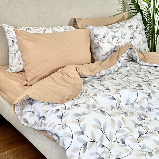 This stylish set offers a reversible design, allowing you to choose between a solid beige color or a chic printed pattern.