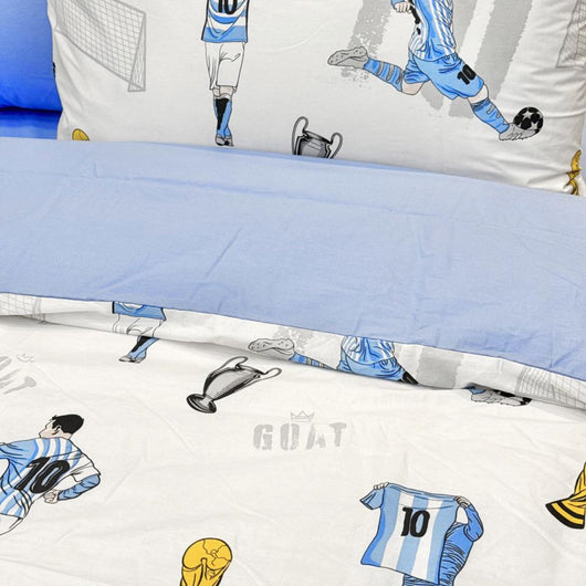 This 3-piece set includes a duvet cover (160x205 cm), a fitted sheet (120x200 cm), and two pillowcases (50x75 cm), perfect for football fans.