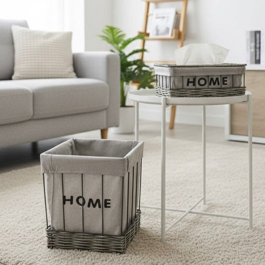 The HOME Fabric-Lined Basket & Tissue Holder Set in Square Grey offers modern style and practical storage for any room.