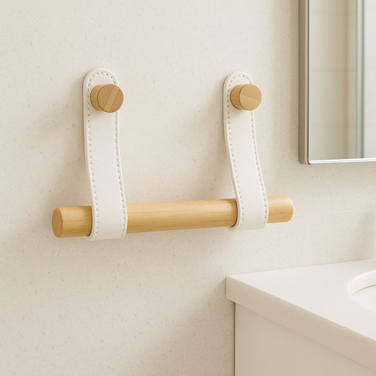 The Tall Bathroom Wall Mounted Holder Bamboo is a sleek and practical storage solution for toilet paper, towels, and more in the bathroom or kitchen.