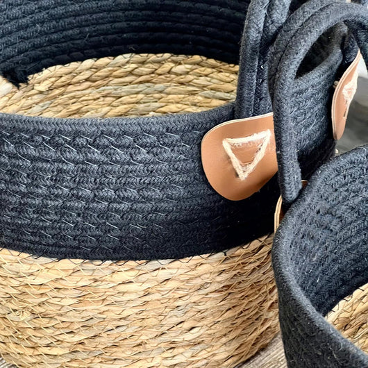COTTON ROPE ROUND BASKET SET WITH HANDLES BLACK