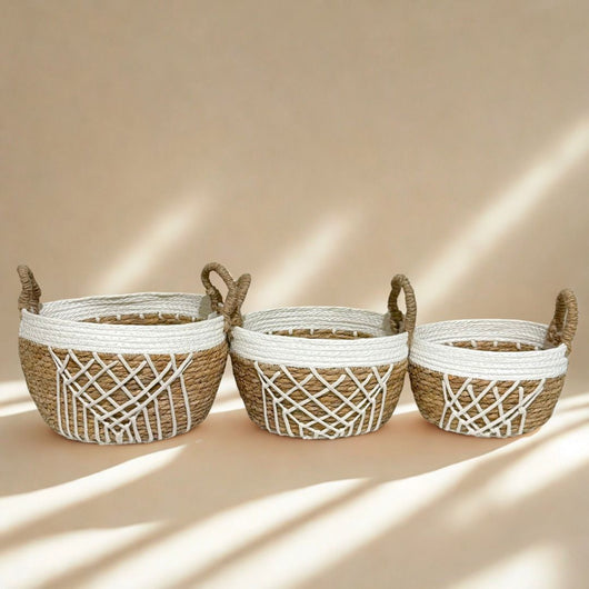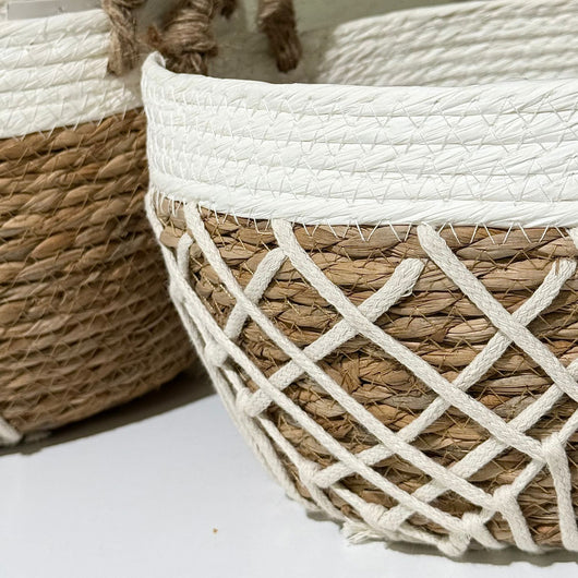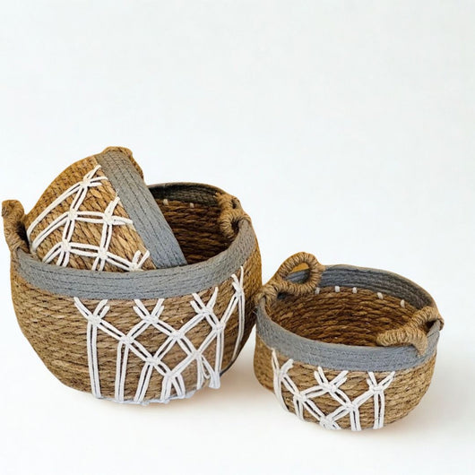 Organize your space with this stylish 3-piece straw and grey basket set, blending natural texture with modern color.