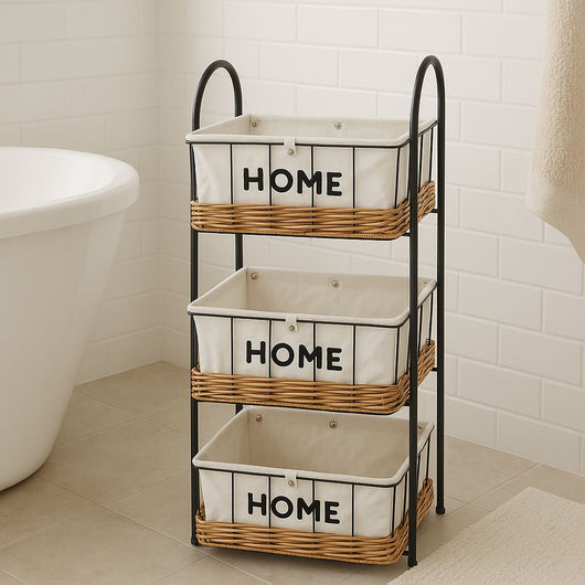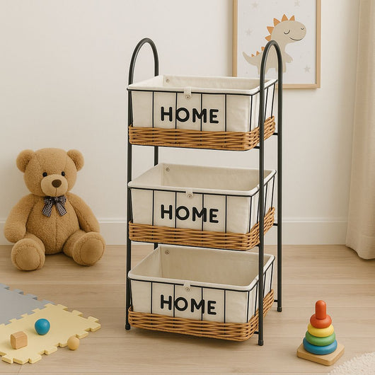 Featuring three spacious baskets made of durable fabric with rattan accents, it perfectly blends functionality with a cozy home aesthetic.