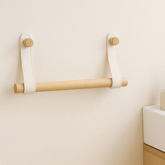 The Tall Bathroom Wall Mounted Holder Bamboo is a sleek and practical storage solution for toilet paper, towels, and more in the bathroom or kitchen.